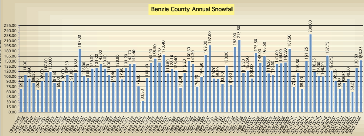As measured at the Benzie County Road Commission, the official annual snowfall